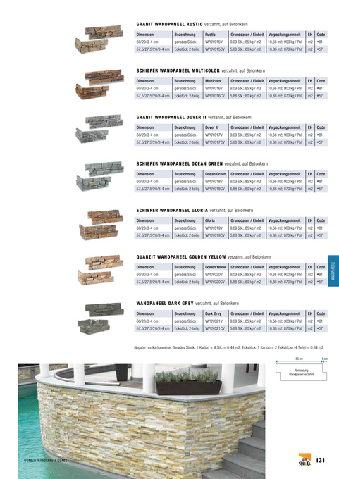 dimension 60/20/3-4 cm 57,5/27,5/20/3-4 cm bezeichnung gerades Stück Eckstück 2-teilig rustic WPDY015V WPDY015CV grunddaten / einheit 9,09 Stk.; 85 kg / m2 5,88 Stk.; 80 kg / m2 verpackungseinheit 10,56 m2; 900 kg / Pal. 10,88 m2; 870 kg / Pal. eh m2 m2 Code