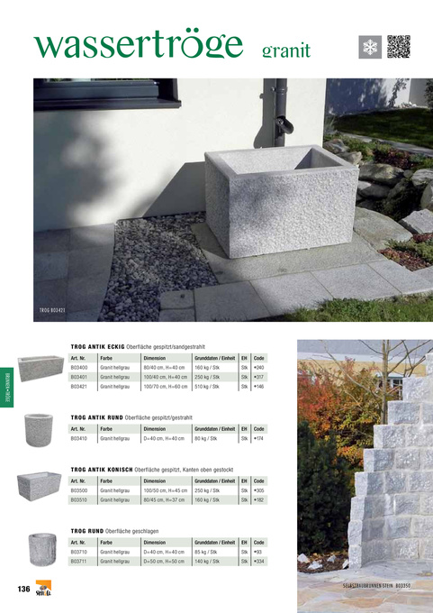 wassertröge granit Trog B03421 trog an ti k e c ki g Oberfläche gespitzt/sandgestrahlt Art. Nr. B03400 Farbe Granit hellgrau Granit hellgrau Granit hellgrau Dimension 80/40 cm, H=40 cm 100/40 cm, H=40 cm 100/70 cm, H=60 cm Grunddaten / Einheit 160 kg / Stk 250 kg / Stk 510 kg / Stk EH Stk Stk Stk Code ° 240 ° 317 °146 BrunnEn•TrögE B03401 B03421 trog an ti k run d Oberfläche gespitzt/gestrahlt Art. Nr. B03410 Farbe Granit hellgrau Dimension D=40 cm, H=40 cm Grunddaten / Einheit 80 kg / Stk EH Stk Code °174 trog an ti k kon i s c h Oberfläche gespitzt, Kanten oben gestockt Art. Nr. B03500 B03510 Farbe Granit hellgrau Granit hellgrau Dimension 100/50 cm, H=45 cm 80/45 cm, H=37 cm Grunddaten / Einheit 250 kg / Stk 160 kg / Stk EH Stk Stk Code ° 305 °182 trog run d Oberfläche geschlagen Art. Nr. B03710 B03711 Farbe Granit hellgrau Granit hellgrau Dimension D=40 cm, H=40 cm D=50 cm, H=50 cm Grunddaten / Einheit 85 kg / Stk 140 kg / Stk EH Stk Stk Code ° 93 ° 334 136 sElBsTBauBrunnEn-sTEin B03350