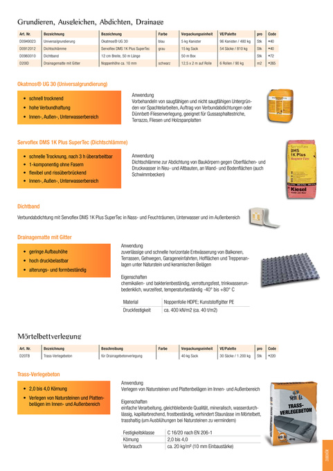 Art. Nr. D0949023 D0912012 D0960010 D20ID Bezeichnung Universalgrundierung Dichtschlämme Dichtband Drainagematte mit Gitter Bezeichnung Okatmos® UG 30 Servoflex DMS 1K Plus SuperTec 12 cm Breite, 50 m Länge Noppenhöhe ca. 10 mm schwarz Farbe blau grau Verpackungseinheit 5 kg Kanister 15 kg Sack 50 m Box 12,5 x 2 m auf Rolle 6 Rollen / 90 kg VE/Palette 96 Kanister / 480 kg 54 Säcke / 810 kg pro Stk Stk Stk m2 Code
