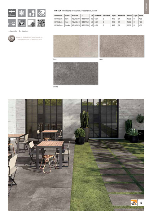 Dimension 80/40/2 cm Farbe Ecru Grey Artikelnr. ABUN050B ABUN051B ID UKN51100 UKN51150 EH m2 m2 EH/Karton Stk/Karton kg/m2 Karton/Pal. EH/Pal. Lager 0,64 0,64 2 2 44,2 44,2 24 24 24 10mm 15,36 15,36 15,36 B B B Code