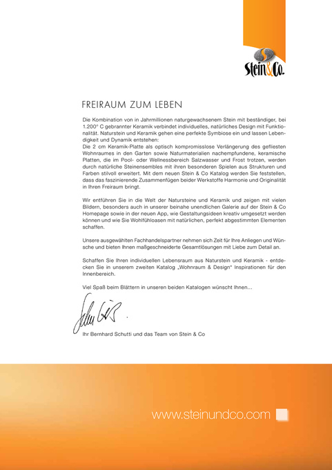 Die Kombination von in Jahrmillionen naturgewachsenem Stein mit beständiger, bei 1.200° C gebrannter Keramik verbindet individuelles, natürliches Design mit Funktionalität. Naturstein und Keramik gehen eine perfekte Symbiose ein und lassen Lebendigkeit und Dynamik entstehen: Die 2 cm Keramik-Platte als optisch kompromisslose Verlängerung des gefliesten Wohnraumes in den Garten sowie Naturmaterialien nachempfundene, keramische Platten, die im Pool- oder Wellnessbereich Salzwasser und Frost trotzen, werden durch natürliche Steinensembles mit ihren besonderen Spielen aus Strukturen und Farben stilvoll erweitert. Mit dem neuen Stein & Co Katalog werden Sie feststellen, dass das faszinierende Zusammenfügen beider Werkstoffe Harmonie und Originalität in Ihren Freiraum bringt. Wir entführen Sie in die Welt der Natursteine und Keramik und zeigen mit vielen Bildern, besonders auch in unserer beinahe unendlichen Galerie auf der Stein & Co Homepage sowie in der neuen App, wie Gestaltungsideen kreativ umgesetzt werden können und wie Sie Wohlfühloasen mit natürlichen, perfekt abgestimmten Elementen schaffen. Unsere ausgewählten Fachhandelspartner nehmen sich Zeit für Ihre Anliegen und Wünsche und bieten Ihnen maßgeschneiderte Gesamtlösungen mit Liebe zum Detail an. Schaffen Sie Ihren individuellen Lebensraum aus Naturstein und Keramik - entdecken Sie in unserem zweiten Katalog „Wohnraum & Design“ Inspirationen für den Innenbereich. Viel Spaß beim Blättern in unseren beiden Katalogen wünscht Ihnen…