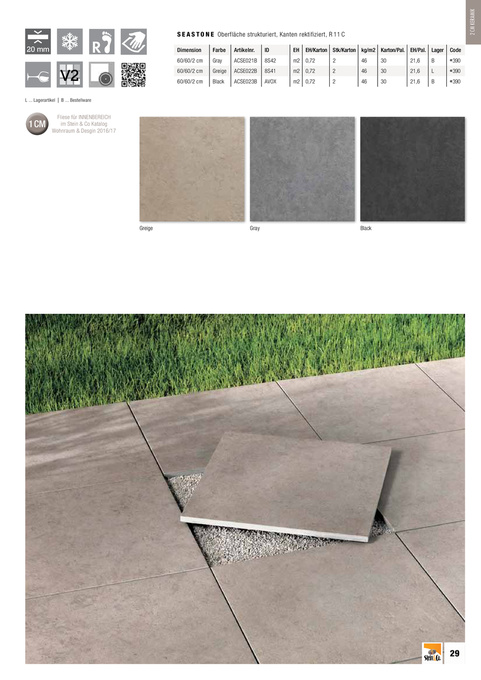 Dimension 60/60/2 cm Farbe Gray Greige Artikelnr. ACSE021B ACSE022B ID 8S42 8S41 EH m2 m2 EH/Karton Stk/Karton kg/m2 Karton/Pal. EH/Pal. Lager 0,72 0,72 2 2 46 46 30 30 30 10mm 21,6 21,6 21,6 B L B Code