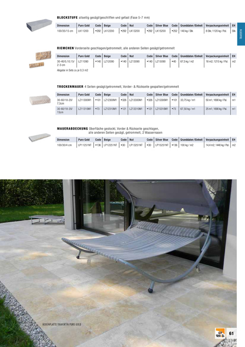 dimension 30-40/5;10;15/ 2-3 cm pure gold LZ11090 Code beige LZ12090 Code nut LZ13090 Code Silver blue LZ15090 Code grunddaten / einheit 67,5 kg / m2 verpackungseinheit 18 m2; 1215 kg / Pal. eh m2