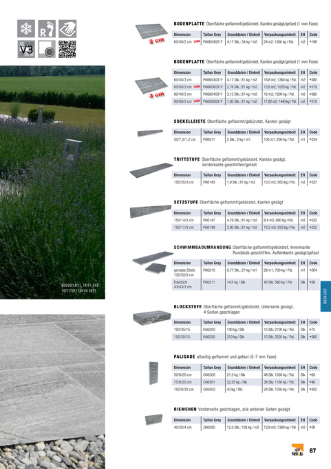R V3 V4 R IM TEXT B o d e n p l at t e Oberfläche geflammt/gebürstet, Kanten gesägt/gefast (1 mm Fase) 2 2 cm R 11B dimension taifun grey grunddaten / einheit 4,17 Stk.; 54 kg / m2 verpackungseinheit 24 m2; 1300 kg / Pal. eh m2 Code 60/40/2 cm neu P66604021F °196 R9 IM TEXT 10mm R 11B R9 B o d e n p l at t e Oberfläche geflammt/gebürstet, Kanten gesägt/gefast (1 mm Fase) dimension 60/40/3 cm taifun grey P66604031F grunddaten / einheit 4,17 Stk.; 81 kg / m2 2,78 Stk.; 81 kg / m2 3,12 Stk.; 81 kg / m2 1,85 Stk.; 81 kg / m2 verpackungseinheit 16,8 m2; 1360 kg / Pal. 12,6 m2; 1020 kg / Pal. 16 m2; 1300 kg / Pal. 17,82 m2; 1440 kg / Pal. eh m2 m2 m2 m2 Code 10mm °380 °319 °380 °319 60/60/3 cm neu P66606031F 10mm 3 cm 80/40/3 cm P66804031F 90/60/3 cm neu P66906031F S o c k e l l e i S t e Oberfläche geflammt/gebürstet, Kanten gesägt dimension 50/7,5/1,2 cm taifun grey P66011 grunddaten / einheit 2 Stk.; 2 kg / m1 verpackungseinheit 100 m1; 200 kg / Pal. eh m1 Code °234 TEXT R 11B R9 10mm t r i t t S t u f e Oberfläche geflammt/gebürstet, Kanten gesägt, Vorderkante geschliffen/gefast dimension 150/35/3 cm taifun grey P66145 grunddaten / einheit 1,9 Stk.; 81 kg / m2 verpackungseinheit 10,5 m2; 850 kg / Pal. eh m2 Code °337 S e t z S t u f e Oberfläche geflammt/gebürstet, Kanten gesägt dimension 150/14/3 cm 150/17/3 cm taifun grey P66147 P66148 grunddaten / einheit 4,76 Stk.; 81 kg / m2 3,92 Stk.; 81 kg / m2 verpackungseinheit 8,4 m2; 680 kg / Pal. 10,2 m2; 830 kg / Pal. eh m2 m2 Code °232 °232 s c h w iM M B a d u M r a n d u n G Oberfläche geflammt/gebürstet, Innenkante Rundstab geschliffen, Außenkante gesägt/gefast dimension gerades Stück 130/33/3 cm taifun grey P66210 P66211 grunddaten / einheit 0,77 Stk.; 27 kg / m1 14,5 kg / Stk verpackungseinheit 26 m1; 700 kg / Pal. 40 Stk; 580 kg / Pal. eh m1 Stk Code °204 °56 taifun grey Bodenpl at te, trit t- und setzstufe taifun grey Eckstück 43/43/3 cm B l o c k S t u f e Oberfläche geflammt/gebürstet, Unterseite gesägt, 4 Seiten geschlagen dimension 100/35/15 150/35/15 taifun grey K66200 K66250 grunddaten / einheit 140 kg / Stk 210 kg / Stk verpackungseinheit 15 Stk; 2100 kg / Pal. 12 Stk; 2520 kg / Pal. eh Stk Stk Code °75 °300 pa l i S a d e allseitig geflammt und gefast (5-7 mm Fase) dimension 50/8/20 cm 75/8/20 cm 100/8/20 cm taifun grey C66500 C66501 C66502 grunddaten / einheit 21,5 kg / Stk 32,25 kg / Stk 43 kg / Stk verpackungseinheit 48 Stk; 1030 kg / Pal. 36 Stk; 1160 kg / Pal. 24 Stk; 1030 kg / Pal. eh Stk Stk Stk Code °65 °46 °302 r i e m c h e n Vorderseite geschlagen, alle anderen Seiten gesägt dimension 40/20/4 cm taifun grey Z66090 grunddaten / einheit 12,5 Stk.; 108 kg / m2 verpackungseinheit 12,8 m2; 1380 kg / Pal. eh m2 Code °36 87